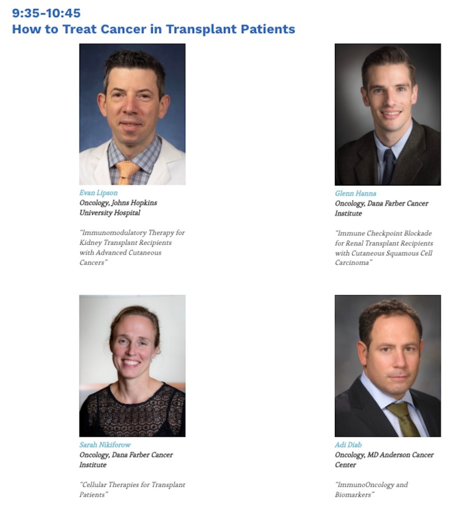The conference was organized by Transplant Oncology Workgroup, a group of nephrologists from major cancer centers in the United States (Dana Farber Cancer Center, Memorial Sloan Kettering Cancer Center, MD Anderson Cancer Center, Mayo Clinic, and Fred Hutch Cancer Center). Speakers discussed up-to-date data on immune checkpoint blockade use in transplant recipients (kidney and liver transplant), and novel cellular therapy in transplant recipients. In the patient roundtable discussion, we invited two transplant recipients to discuss unmet needs in post-transplant care and cancer diagnosis and therapy. Education on cancer risk post-transplant, information sharing, and patient-empowered decision making were identified as key areas of improvement. The conference concluded with great success, and plans to continue annually to discuss the challenging areas of cancer post-transplant.